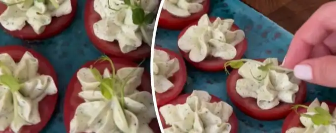 Recept na veľmi chutnú paradajkovú desiatu. Odkaz skopírovaný Rýchly predkrm, ktorý sa stane hviezdou stola / Koláž: My, foto: snímky z videa Paradajky
